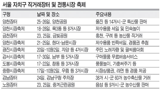 추석명절(10월2~4일)을 앞두고 서울시내 구청에서 운영하는 ‘우리 농수축산물 직거래 장터’에 가면 품질좋은 제수용품 등 추석 성수품을 시중보다 저렴한 가격에 구입할 수 있다.