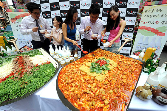 27일 오전 서울 종로구 관철동에 있는 전통주점 ‘짚동가리쌩주’에서 직원들이 막걸리와 닭요리를 무료로 나눠주는 시식행사를 벌이고 있다.