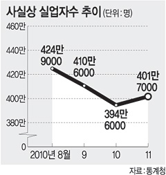 이처럼 각종 고용지표가 호조세를 나타내고 있지만 서민들의 체감 고용을 나타내는 지표는 이와 반대 방향으로 가고 있다. 11월 실업자수가 73만7000명으로 전월(83만2000명)대비 9만5000명 감소한 것과 달리 서민들이 느끼는 사실상 실업자수(실업자+취업준비+쉬었음+구직단념자+18시간 미만 취업자)는 401만7000명으로 상승했다. 사실상 취업자수는 지난 10월 394만6000명을 기록하며 5개월 만에 400만명선 아래로 내려갔으나 11월 다시 400만명대로 복귀했다.