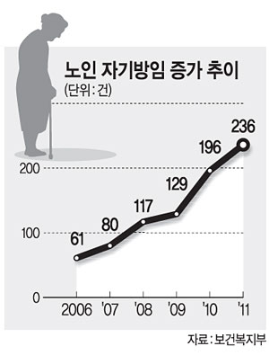 13일 보건복지부에 따르면 노인학대의 한 유형으로 분류되는 자기방임이 지난 2006년 61건에서 지난해 236건으로 5년 새 3.9배 급증한 것으로 나타났다.