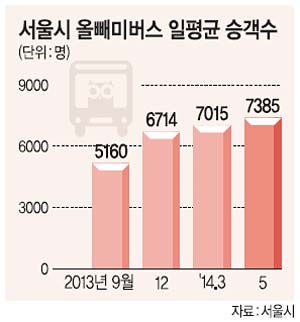 17일 서울시에 따르면 지난해 9월에는 하루 평균 탑승인원이 5160명이었으나 지난 5월 기준으로 7385명이 매일 이용하고 있는 것으로 나타났다. 하지만 올빼미버스가 모든 이의 기대속에 탄생한 것은 아니다. ‘그 시간에 몇 명이나 이용하겠느냐’는 우려도 적지 않았던 게 사실이다. 하지만 이러한 우려와 달리 올빼미버스는 대박이 났다.