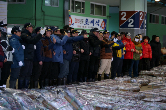 2일 오전 부산 서구 부산공동어시장에서 고등어, 꽁치, 방어 등 연근해에서 잡힌 각종 수산물에 대한 경매가 시작되자 중도매인들의 손가락이 바쁘게 움직이고 있다. 수지호가식(手指呼價式)으로 진행된 이날 경매는 2015년 을미년 새해 들어 처음으로 열린 초매식(初賣式)으로 김무성 새누리당 대표, 서병수 부산시장 등도 직접 참석, 을미년 새해의 새롭고 힘찬 출발과 풍어를 기원했다.