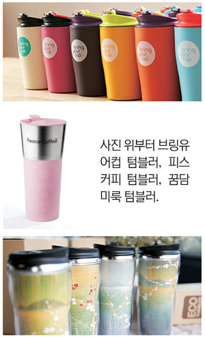 ‘브링유어컵’은 텀블러 문화를 정착시키기 위한 사업을 하는 사회적기업이다. 제휴 중인 카페에 브링유어컵에서 생산한 텀블러를 가져오면 커피값을 큰 폭으로 할인해 준다. 브링유어컵은 텀블러의 뚜껑과 컵의 색상을 구매자가 원하는 톤으로 조합해 달라고 주문하면 이에 따라 개성 있는 텀블러를 제작하는 서비스를 제공하고 있다. 72시간 제품을 회전시켜 액체가 새는지를 확인하는 방식의 밀폐력 테스트에서 합격한 제품인 만큼 가방 안에 넣고 다녀도 안심할 수 있다. 브링유어컵에서 구입한 텀블러를 가지고 제휴 카페를 방문하면 한 잔당 500∼3000원 할인된 금액으로 커피를 즐길 수 있다. 브링유어컵은 지금까지 서울 시내 30여 개 카페와 제휴를 맺고 있다. 현재는 프랜차이즈 커피 전문점과 힘겹게 경쟁하는 소규모 카페와의 제휴를 늘려 가고 있는 중이다. 텀블러 구매는 브링유어컵 홈페이지(www.bringyourcup.co.kr/cafe)에서 가능하다.