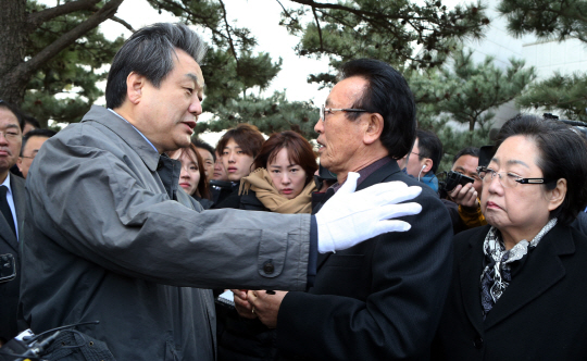 김무성(왼쪽) 새누리당 대표가 19일 오전 제주시 봉개동 4·3평화공원을 찾아 참배한 뒤 정문현(가운데) 4·3희생자유족회장의 어깨에 손을 얹으며 이야기를 나누고 있다.