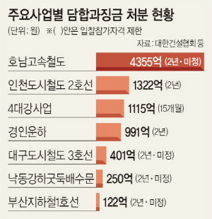 공정위는 연초부터 강원 원주~강릉 철도 건설공사를 진행 중인 한진중공업, 현대건설, 두산중공업, KCC건설 등 4개 업체에 대해 담합 조사에 들어간 데 이어 지난주부터는 금호산업 컨소시엄 외에 현대산업개발과 동부건설 등을 상대로 군부대 영내시설공사 담합 조사에 착수한 것으로 알려졌다. 여기에 국내 공공공사의 경우 최저가 입찰경쟁이 많아 실제 공사에 들어갈 경우 불가피하게 적자를 보는 등 질도 크게 떨어지고 있다.