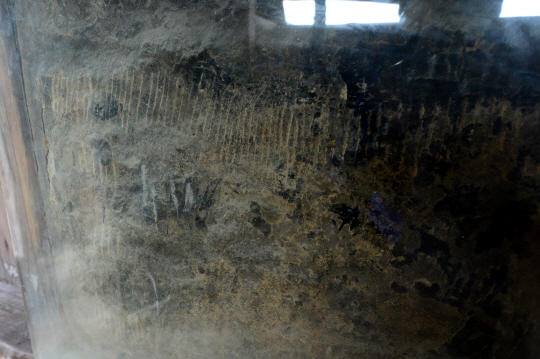 관광지가 되면서 번거로운 일도 생기고 여름에는 노래방기기까지 틀어놓아서 시끄럽지만, 주민들은 그게 사람 사는 일이려니 한다. 김 씨는 내성천도 옛날 같지 않다고 볼멘소리를 한다. 4대강 사업으로 하류인 낙동강을 파내면서 모래가 떠내려가는 바람에 바닥이 무척 낮아졌다. 삼강주막은 회룡포에서 멀지 않은 곳에 있다. 주막의 관리 주체는 예천군이지만 운영은 삼강마을 주민들이 맡고 있다. 녹색농촌체험마을 회원들이 힘을 합쳐 음식도 만들어 팔고 공연도 준비하고 축제도 연다. 삼강주막에 가면 꼭 들러볼 곳이 있다. 바로 유옥연 할머니가 쓰던 부엌. 무척 좁아 보이는 부엌은 여느 시골살림과 크게 다르지 않다. 솥이 두 개 걸려 있고, 바닥에 묻어놓은 술독 하나와 나무로 만든 찬장 하나. 그런데 자세히 보면 벽에 그어져 있는 숱한 눈금(사진)을 발견할 수 있다. 바로 유 할머니의 외상장부다. 한글을 몰랐던 주모는 누가 막걸리를 먹고 외상을 하면 벽에 ‘누구, 얼마’라고 금을 그었다. 일반 사람이 보기에는 그저 아래위로 그어놓은 금에 불과하지만, 그것만으로 사람과 액수를 구분할 수 있었다고 한다. 즉, 자신만 아는 암호가 있었던 것이다.