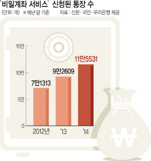 은행 별로 약 1만∼2만 명 가량의 고객이 관련 서비스를 이용하고 있는 것으로 알려졌다. 매년 서비스 신청 고객도 늘고 있는데 신한·국민·우리 3개 은행에서 비밀계좌 서비스 신청 계좌 수는 지난 2012년 말 7만1313개에서 2014년 말 11만5531개로 늘었다.
