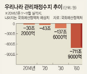 국회예산정책처 추산을 보면 우리나라의 관리재정수지 적자액은 오는 2020년에는 43조 원, 2030년에는 137조6000억 원으로 급등할 것으로 전망된다. 이는 앞으로 15년 후에는 우리나라의 국가 재정이 버티기 어려운 상황에 빠지게 된다는 사실을 보여주는 것이다.