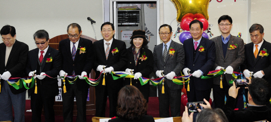 고두심(왼쪽 다섯 번째) 초록우산어린이재단 나눔대사, 김군선(〃여섯 번째) 신세계 부사장 등이 29일 경북 안동시 안동 구시장에서 신세계그룹이 30번째로 설치한 희망장난감도서관 개관식에 참석, 테이프를 자르고 있다.
