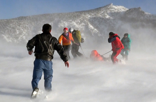 1일 제주 제주시 해안동 한라산 해발 1695m 삼각봉 부근에서 동계 산악훈련을 하던 산악인이 다리를 다쳐 시내 병원으로 긴급 이송되고 있다.