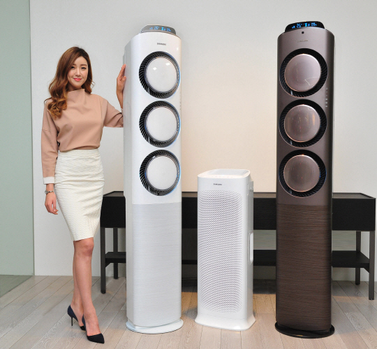 삼성전자는 황사·미세먼지 등 각종 오염된 공기로부터 집 안 공기의 질을 쾌적하게 지켜주는 2015년형 ‘스마트에어컨 Q9000’(사진 왼쪽)과 공기청정기 ‘블루스카이 AX7000’(가운데)도 소개했다. 두 제품 모두 미세먼지·초미세먼지·가스를 감지하는 ‘트리플 청정센서’를 갖춰 실시간으로 공기의 질을 측정해 최적의 공기 상태를 지켜주기 위한 청정 능력이 대폭 강화됐다.