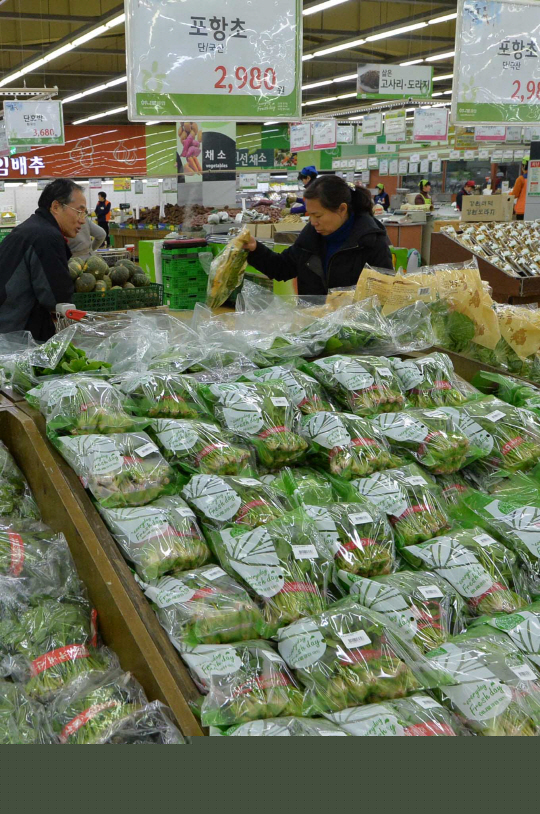 설(19일)을 앞두고 시금치·상추·애호박·고추·피망 등 채소 값이 한파와 냉해의 영향으로 줄줄이 오른 가운데 3일 오전 서울에 있는 한 대형마트에서 고객들이 채소를 고르고 있다.