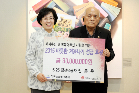 본인을 6·25 참전용사라고 밝힌 전종윤(83·사진 오른쪽) 씨는 형편이 어려운 지역 노인들을 위해 써달라며 성금 3000만 원을 내놨다.