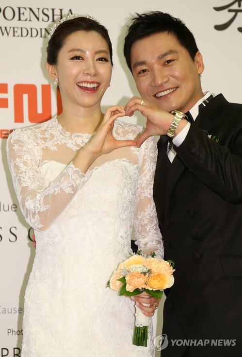 배우 조재윤과 신부 조은애가 7일 오전 서울 강남구 청담동 드레스가든에서 결혼식을 올리기 전 가진 기자회견에서 포즈를 취하고 있다.