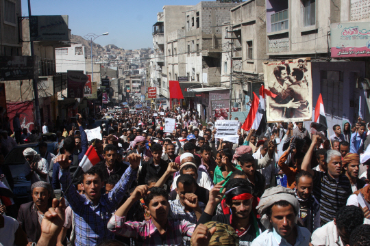 예멘의 시아파 반군 후티가 무력으로 정부를 전복하자 7일 예멘 제3 도시 타이즈에서 후티에 반대하는 시민들이 항의 시위를 벌이고 있다. 후티가 6일 의회와 내각을 해산하고 ‘혁명위원회’를 중심으로 과도정부를 구성해 2년간 예멘을 통치하겠다고 선언하자 남부 분리주의 세력이 거세게 반발하면서 예멘은 통일 25년 만에 남북 분단 위기 상황으로 빠져들고 있다.