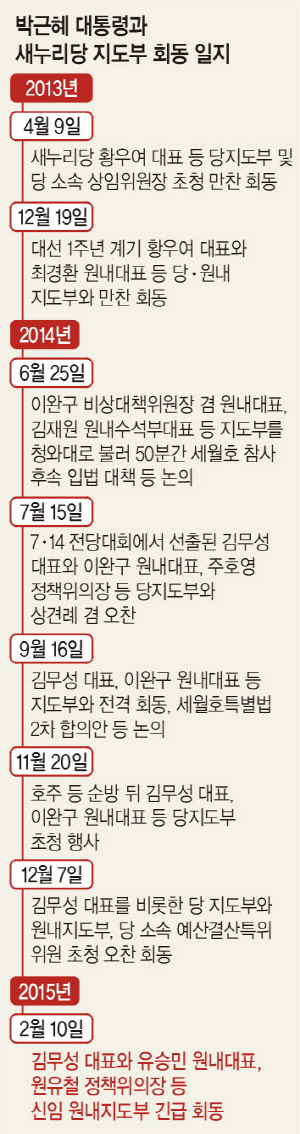 10일 박근혜 대통령과 김무성 새누리당 대표·유승민 원내대표·원유철 정책위의장 등 여당 지도부 간의 청와대 긴급 회동에서는 경제 활성화와 이를 위한 당·청 간, 당·정·청 간 협력에 최선을 다한다는 데 깊이 공감했다. 이날 회동에서는 이외에도 ‘증세 없는 복지’ 문제와 ‘총리 청문·경제 법안 처리’ ‘당·청 소통 강화’ 등 의제들이 집중적으로 논의됐다.