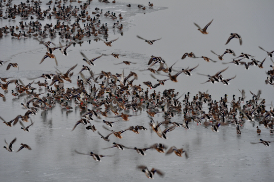 하천이나 논 습지에서 쉽게 볼 수 있는 청둥오리의 고향은 압록강 건너 중국, 내몽골의 드넓은 초지입니다. 번식지와 월동지를 오갈 때는 마치 모래시계 모양으로 모였다가 흩어집니다. 새들은 이동할 때와 월동할 때 가장 많은 위험에 노출됩니다. 아직도 사람의 눈을 피해 인적이 뜸한 곳에서 야생동물에게 총질하는 사람들이 있습니다.