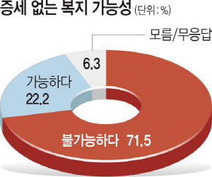 이와 함께 ‘2010년부터 3년 연속 국가재정이 적자를 기록해 박근혜정부의 증세 없는 복지정책의 실효성 논란’과 관련한 질문에 ‘만성적 재정 적자를 피할 수 없으므로 증세 없는 복지는 불가능하다’는 견해에 71.5%가, ‘지하경제 양성화와 구조개혁, 경제 활성화 등을 통해 증세 없는 복지는 가능하다’에 22.2%가 응답했다. 역시 정부정책 기조가 신뢰를 얻지 못하고 있는 결과로 풀이된다. ‘증세 없는 복지 불가능’ 견해는 남자(76.2%), 부산·울산·경남(79.5%), 자영업(78.7%), 화이트칼라(73.2%) 등에서 평균보다 높았고, ‘가능’ 의견은 광주·전라(30.3%), 가정주부(30.6%), 30대(24.7%), 40대(24.4%)에서 평균을 상회했다.
