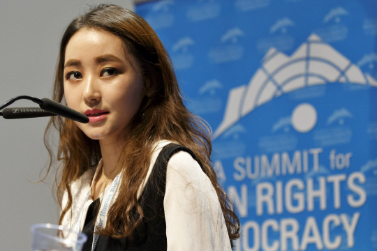 탈북 여대생 박연미 씨가 24일 스위스 제네바에서 열린 제7차 ‘인권과 민주주의를 위한 제네바 정상회의’의 ‘독재에 대한 대항’ 세션에 참석해 북한에서의 생활 및 탈북 과정 등에 대해 설명하고 있다. 박 씨는 외부 세계와 시장에 대해 많이 아는 이른바 ‘장마당 세대’가 북한 독재정권에 큰 위협이 되고 있다고 밝혔다.