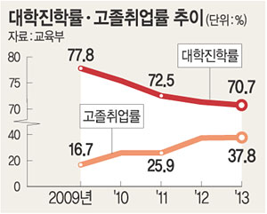 9일 고용노동부에 따르면 지난 2009년 16.7%에 불과했던 고졸 취업률은 2013년 37.8%까지 2배 가까이 증가했다. 청년 취업난과 2008년부터 시작된 정부의 고졸 취업 활성화 정책이 맞물려 대학 대신 취업을 선택하는 청년층이 늘고 있는 것으로 분석된다. 반면 대학졸업자의 취업률은 2014년 54.8%에 불과한 상황이다. 10명 중 5명은 대학 졸업장을 손에 쥐고도 일자리를 구하지 못하는 셈이다.