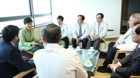 박근혜 대통령이 9일 오전 서울 신촌세브란스병원을 방문해 마크 리퍼트 주한 미국대사 병실에서 의료진에게 치료에 만전을 기해줄 것을 당부하고 있다. 박 대통령의 오른쪽부터 시계 반대 방향으로 정갑영 연세대 총장, 윤도흠 세브란스병원장, 이병기 대통령 비서실장, 인요한 국제진료센터장, 이진우 대외협력처장, 정남식 연세의료원장, 유대현 성형외과 교수.