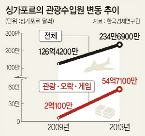 그 결과 2009년 2억100만 싱가포르 달러였던 관광·오락·게임산업 수입이 2013년에는 54억7100만 싱가포르달러로 약 27배 증가하는 등 아시아 대표적 관광지로 부상했다. 특히 카지노를 복합리조트 부대 수익사업으로 유치하면서 카지노에서 발생하는 수익이 총 수익의 70∼80%에 육박하고 있다.