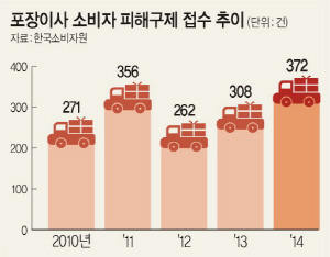 19일 한국소비자원에 따르면 지난해 접수된 포장이사, 반포장이사, 일반이사를 둘러싼 소비자 피해구제 건수는 408건으로, 2013년(336건)에 비해 21% 증가했다. 2012년의 285건에 견줘도 매년 늘어나는 추세다.