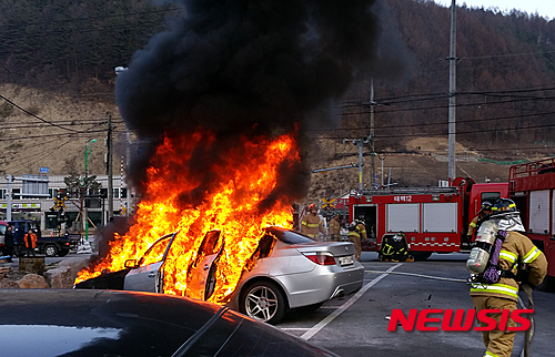 21일 오전7시25분께 강원 태백시 연화동 영동선 철도 건널목 인근 설렁탕집 앞 주차장에 주차된 BMW 승용차에서 갑자기 원인을 알 수 없는 화재가 발생해 한 소방관이 진화하고 있다.