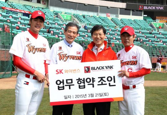 정운석(왼쪽 두 번째) 블랙야크 사장이 임원일(〃세 번째) SK와이번스 대표이사와 21일 인천 남구 인천문학구장에서 선수단 용품 후원 및 공동 마케팅 진행 등에 관한 업무협약을 맺은 후 김광현(〃첫 번째), 조동화(〃네 번째) 선수와 기념촬영을 하고 있다.