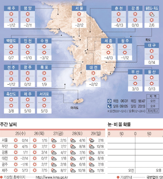 중국 산둥반도 부근에 위치한 고기압의 영향을 받아 전국이 맑겠다. 아침 최저기온은 영하 7도에서 영상 3도, 낮 최고기온은 영상 8도에서 14도가 되겠다.