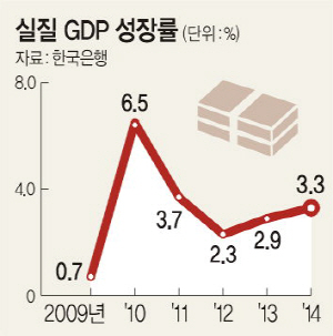 2년 연속 2%대에 머물렀던 우리나라 실질 국내총생산(GDP) 성장률은 지난해 3.3%를 기록하며 회복되는 모습을 보였으나, 소비와 건설투자 등이 위축되면서 회복속도는 하반기에 현저하게 떨어졌다.