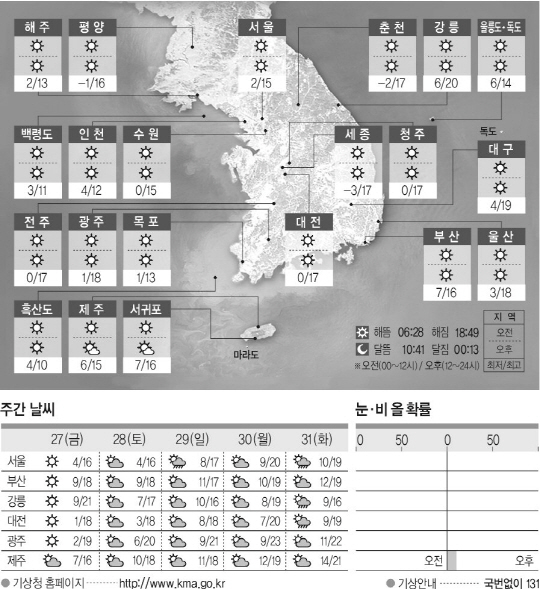 전국이 맑겠다. 아침 최저기온은 영하 4도에서 영상 7도, 낮 최고기온은 영상 12도에서 20도가 되겠다.