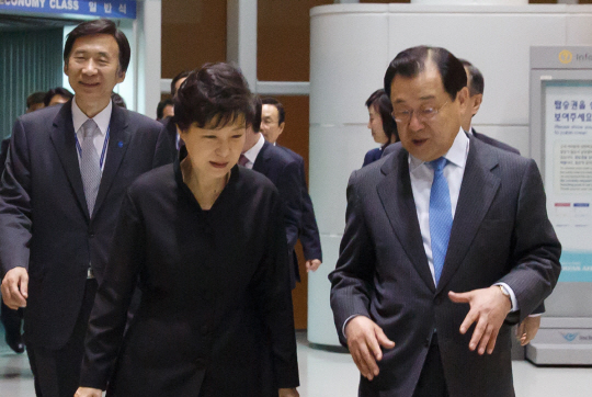 박근혜 대통령이 리콴유 전 싱가포르 총리의 국가장례식에 참석하는 등 1박 3일간의 조문외교를 마친 뒤 30일 새벽 인천국제공항을 통해 귀국하면서 마중나온 이병기 대통령 비서실장과 얘기를 나누고 있다.