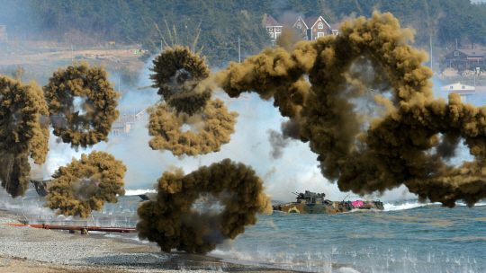 30일 오전 경북 포항시 독석리 해안에서 한·미 해군·해병대가 상륙돌격장갑차 등을 이용해 상륙훈련을 하고 있다.