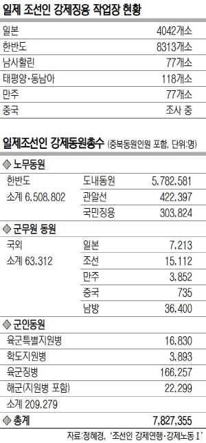 정혜경 동북아재단 강제동원 진상규명위원회 제1과장은 조선인 노무자 동원 작업장은 일본에 4042개, 한반도에 8313개, 남사할린에 77개, 태평양·동남아에 118개, 만주에 77개나 있었으며, 중국 작업장은 조사 중이라고 밝혔다. ‘국민징용령’ 공포 이후 1939∼1945년 사이 한반도 내 일제 작업 강제 동원 한국인은 약 480만 명이었다. 일본 본토와 남양군도 남사할린 등지에 노동력으로 강제 연행된 한국인만 약 153만 명이었다.