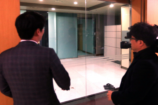방위사업 비리 의혹으로 검찰 수사를 받고 있는 이규태 일광공영 회장의 ‘비밀공간’이 있는 것으로 알려진 서울 성북구 돈암동의 한 교회 앞에서 30일 기자들이 취재를 시도하고 있다. 이 회장 집무실의 비밀공간은 책장 뒤 비밀번호를 눌러야 들어갈 수 있는 것으로 알려졌다.