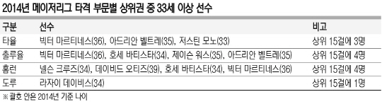 게다가 33세 이상 타자가 메이저리그에서 맹활약하는 경우도 많지 않다. 지난 시즌 메이저리그 타율 ‘톱 15’ 가운데 33세 이상은 빅터 마르티네스(디트로이트 타이거스)와 아드리안 벨트레(텍사스), 저스틴 모노(콜로라도 로키스) 등 3명뿐이었다.