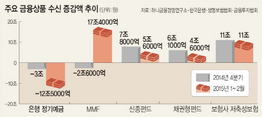 반면 같은 기간 보험사 저축성보험은 보장성보험과 달리 만기에 약속한 이율을 받을 수 있다는 점이 저금리 기조에 장점으로 작용한 탓인지 수신 자금이 11조 원 늘었다. 자산운용사의 머니마켓펀드(MMF)나 신종펀드, 채권형 펀드에도 각각 17조4000억 원, 5조6000억 원, 4조6000억 원의 자금이 몰렸다.