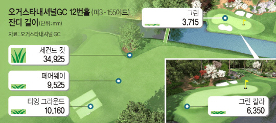 오거스타내셔널골프클럽의 코스 세팅은 군더더기가 없다. 매년 0.1㎜의 오차도 없이 똑같게 세팅이 된다. 우선 티잉 그라운드의 잔디는 10.16㎜에, 페어웨이는 이보다 짧은 9.525㎜로 맞춰 놓는다. 러프 구실을 하는 ‘세컨드 컷’은 34.925㎜로 여느 대회의 러프보다 짧다. 볼이 안 보일 만큼 파묻히지는 않지만 그린에서 세우려면 클럽 사이에 풀이 끼기 때문에 고난도의 정교한 샷이 필요하다.