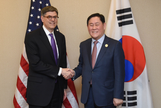 최경환(오른쪽) 부총리 겸 기획재정부 장관이 15일 오후(현지시간) 미국 워싱턴 국제통화기금(IMF) 본부에서 제이컵 루 미국 재무장관과 만나 악수를 나누고 있다. 최 부총리는 주요 20개국(G20) 재무장관·중앙은행총재 회의와 IMF·세계은행 춘계회의 참석을 위해 미국을 방문 중이다. 기재부 제공