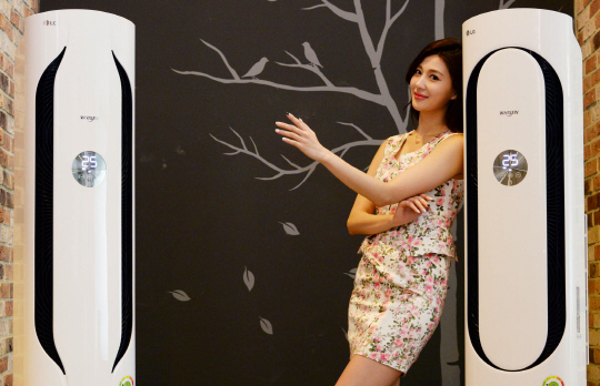 LG전자가 21일 슬림한 디자인의 스탠드형 휘센 에어컨 신제품 5종을 출시한 가운데 모델이 새로 나온 제품을 소개하고 있다.