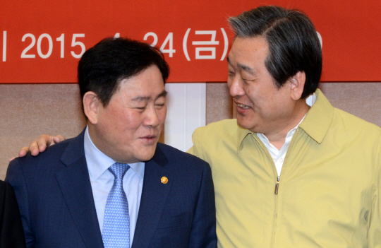 김무성(오른쪽) 새누리당 대표가 24일 오전 국회 귀빈식당에서 열린 쌀 수급 안정 대책 당정 회의에서 최경환 부총리 겸 기획재정부 장관의 어깨에 손을 얹고 이야기를 나누고 있다.