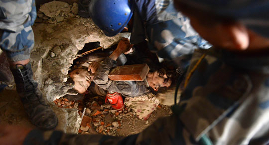 81년 만에 강진이 발생한 네팔 수도 카트만두의 건물 붕괴 현장에서 26일 한 남성이 기둥에 매달려 구조요원들의 손길을 기다리고 있다. 하루 전 네팔을 강타한 규모 7.8의 강진으로 3218명이 사망한 것으로 추정되고 있다. 26일에도 여진이 수십 차례 이어지면서 생존자 구조는 물론 구호 활동도 제대로 이뤄지지 못하고 있다. 유엔개발계획(UNDP)에 따르면 네팔의 40% 이상의 지역이 이번 대지진으로 피해를 입었다.