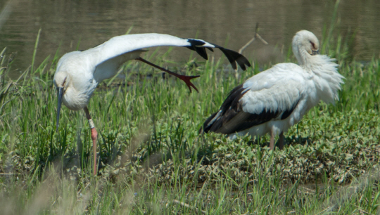 시베리아에서 날아온 야생 수컷 황새(천연기념물 199호·오른쪽)와 한국교원대 황새복원센터에서 탈출한 암컷 황새 ‘미호’가 27일 오전 충북 진천군 백곡천변에서 다정하게 노닐며 한반도에서 지난 1971년 사라진, 자연번식에 의한 황새 탄생 기대감을 높이고 있다.