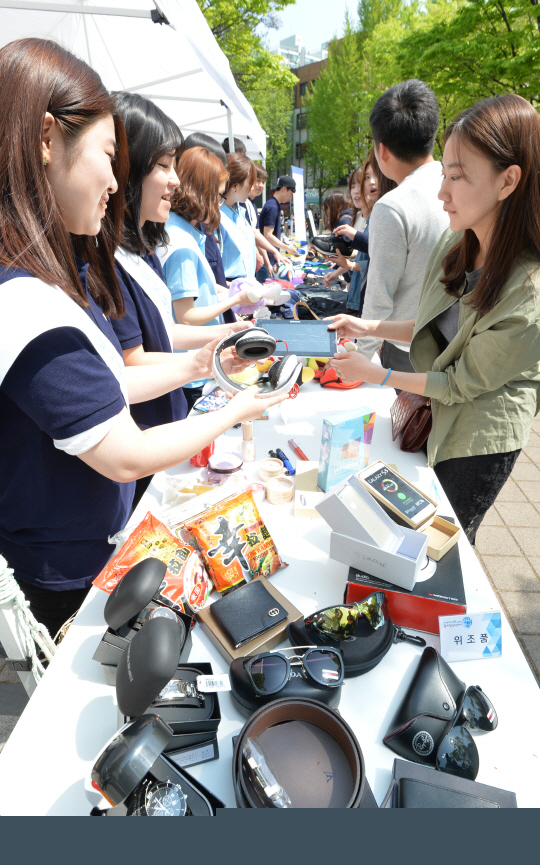 특허청과 한국지식재산보호협회가 ‘세계지식재산의 날’인 26일 서울 서대문구 대현공원에서 위조상품 사용 금지와 지식재산권 보호에 동참을 호소하는 캠페인을 벌이고 있다.