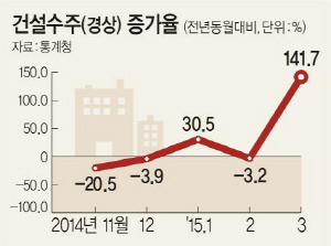 30일 통계청이 내놓은 ‘2015년 3월 산업활동동향’을 살펴보면 올 3월 산업활동동향에서 가장 눈에 띄는 점은 건설수주(경상) 증가율이 전년동월대비 141.7%로 2002년 3월(173.2%) 이후 13년 만에 최대치를 기록한 것이다. 지난해 7월 최경환 부총리 겸 기획재정부 장관 취임 이후 총력을 기울여온 부동산 경기 부양책이 드디어 경기 지표로 확인될 만큼 효과를 나타내고 있다는 뜻이다.