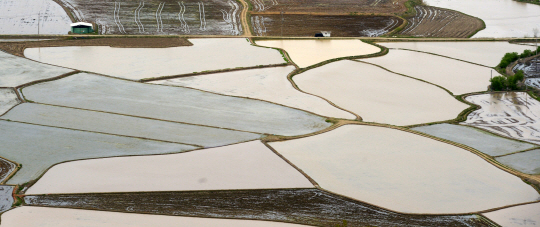 11일 오전 강원 철원군 동송읍 철원평야에 모내기를 위해 물을 댄 모습이 한 폭의 그림처럼 펼쳐져 있다.