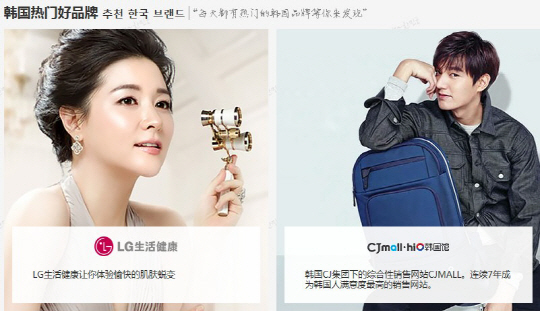 중국 최대 전자상거래업체인 알리바바가 온라인 쇼핑몰 티몰에 한국 제품을 판매하는 전용관인 한국관(사진)을 개설하며 내로라하는 한류스타들을 전면에 배치했다. 티몰에 입점된 한국 브랜드는 대부분 중국에서 인기가 높은 스타들을 모델로 기용하고 있다. 사극 ‘대장금’으로 중국어권에 이름을 널리 알린 원조 한류스타 이영애를 필두로 이민호, 김수현, 아이돌 그룹 엑소와 전지현, 김희선, 이다해 등의 얼굴을 확인할 수 있다.