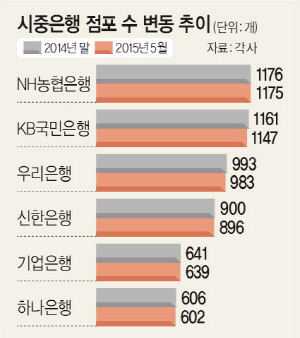 문화일보가 KB국민·신한·우리·하나·NH농협·기업은행 등 6개 주요 시중은행의 점포 수 변동 추이를 살펴본 결과, 5월 현재 기준 이들 은행의 전체 점포 수는 5442개로 지난해 말 대비 35개 줄었다. 금융권 관계자는 “기존 창구인력이 대폭 줄고, 상담 등의 전문인력 양성 및 관련 업무배치가 이뤄질 것”이라고 말했다.