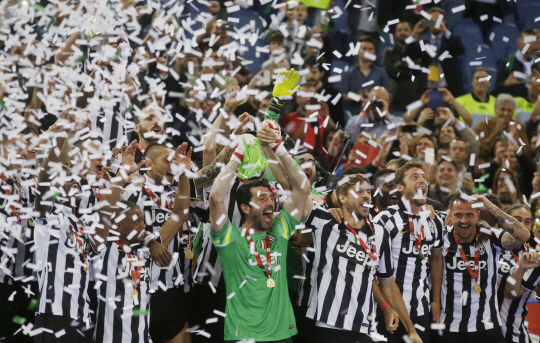 이탈리아 프로축구 유벤투스 선수들이 21일(한국시간) 이탈리아 로마의 스타디오 올림피코에서 열린 이탈리아컵 결승전에서 라치오를 꺾고 20년 만에 우승을 차지한 뒤 환호하고 있다.